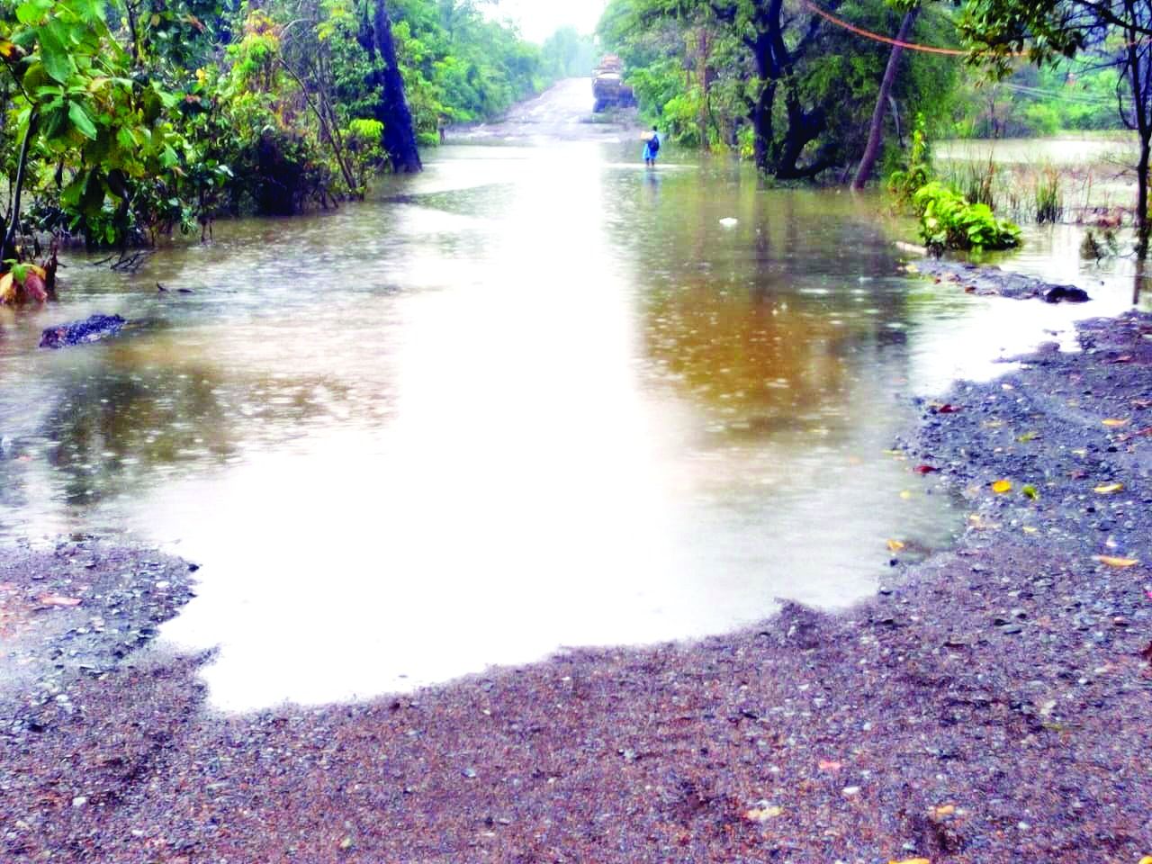 तेज बारिश के दौरान पानी सडक़ के उपर तक आ गया है और पानी का निकासी न होने से जल स्तर मार्ग के उपर पांच फीट से अधिक भर जाने से मार्ग बंद पड़ा हुआ है। इस रोड से गुजरने वाले लोग जान जोखिम में डालकर इस पुल को पैदल पार कर रहे हैं।