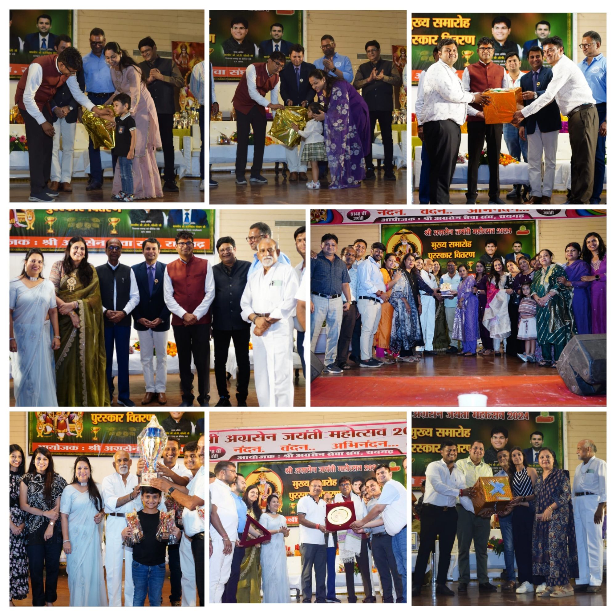 रायगढ़ 5 अक्टूबर : नगर में चल रही महाराजा श्री अग्रसेन जयंती 22 सितंबर से 3 अक्टूबर तक चली जिसमें 100 से अधिक विभिन्न प्रतियोगिताएं एवं सांस्कृतिक कार्यक्रमों का आयोजन हुआ।शुक्रवार 4 अक्टूबर को निगम ऑडिटोरियम में पुरस्कार वितरण एवं समापन समारोह का आयोजन किया गया। जिसमें बतौर मुख्य अतिथि छत्तीसगढ़ शासन में वित्त मंत्री एवं रायगढ़ विधायक ओ.पी. चौधरी एवं विशिष्ट अतिथि रायगढ़ कलेक्टर कार्तिकेय गोयल शामिल हुए। अग्र समाज ने उनका आत्मीय स्वागत किया। उनके साथ मंच पर पूर्व विधायक विजय अग्रवाल, अग्रसेन सेवा संघ के कार्यवाहक अध्यक्ष बजरंग अग्रवाल (लेन्ध्रा),अग्रोहा धाम ट्रस्ट के अध्यक्ष सुशील मित्तल,पूर्व अध्यक्ष राकेश अग्रवाल,मनीष पालीवाल,बजरंग अग्रवाल (जूटमिल),कविता बेरीवाल एवं आशा टाइटन मौजूद थे। कार्यक्रम का शुभारंभ महाराजा श्री अग्रसेन की प्रतिमा पर दीप प्रज्वलित कर हुआ। सर्वप्रथम मंच पर उपस्थित अतिथियों का समिति के सदस्यों ने स्वागत किया। समारोह में स्वागत उद्बोधन अग्रसेन सेवा संघ के पूर्व अध्यक्ष प्रदीप गर्ग ने दिया। उन्होंने समारोह में पधारे सभी अतिथियों का स्वागत करते हुए जयंती की पूरी रूपरेखा के बारे में वित्त मंत्री और कलेक्टर साहब को विस्तार से अवगत कराया। इसके पूर्व विधायक एवं ओजस्वी वक्ता विजय अग्रवाल ने अपना उद्बोधन दिया। हर्ष न्यूज़ के डायरेक्टर सुशील मित्तल ने समाज को संबोधित किया। श्री अग्रसेन सेवा संघ के पूर्व अध्यक्ष मुकेश मित्तल ने भी अपने उर्जा शब्दों से समाज में नई ऊर्जा भर दी। विशिष्ट अतिथि कलेक्टर कार्तिकेय गोयल ने बहुत ही सुंदर शब्दों में समाज के साथ तालमेल बनाया एवं वित्त मंत्री और रायगढ विधायक ओ.पी. चौधरी जी ने अग्र समाज को संबोधित किया और आयोजन समिति को शानदार आयोजन की शुभकामनाएं दी। वरिष्ठ पत्रकार अनिल रतेरिया ने भी अपने जीवन के कुछ पल याद करते हुए समाज को इस स्तर तक लाने में उनके संघर्षों के बारे में बताया। समारोह में सर्वप्रथम अग्र विभूति सम्मान किया गया। जिसमें समाज के वरिष्ठ सदस्य एवं वरिष्ठ पत्रकार अनिल रतेरिया,अग्रोहा धाम ट्रस्ट के संस्थापक अध्यक्ष राकेश अग्रवाल एवं समाज के सक्रिय युवा प्रकाश निगानिया का सम्मान किया गया। पुरस्कार वितरण में परंपरा अनुसार सर्वप्रथम महाराजा अग्रसेन बने आदित्य अग्रवाल (साबुन) को सम्मानित किया गया। इसके बाद जयंती में आयोजित प्रतियोगिताओं के विजई प्रतिभागियों को सम्मानित किया गया। वित्त मंत्री ने समाज के छोटे-छोटे बच्चों को अपने हाथों से पुरस्कार दिए और उनके हाथों से यह पुरस्कार पाकर सभी बहुत खुश नजर आए। श्री अग्रसेन सेवा संघ और आयोजन समिति ने मुख्य अतिथि और विशिष्ट अतिथि को स्मृति चिन्ह 