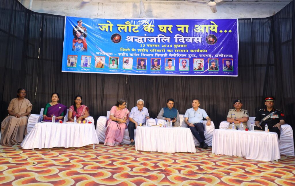 रायगढ़, 13 नवम्बर 2024/ शहीद कर्नल विप्लव त्रिपाठी के श्रद्धांजलि दिवस के अवसर पर आज शहीद कर्नल विप्लव त्रिपाठी मेमोरियल ट्रस्ट रायगढ़ एवं जिला सैनिक कल्याण द्वारा पॉलिटेक्निक कॉलेज आडिटोरियम में जिले के शहीद परिवारों का सम्मान कार्यक्रम आयोजन किया गया।