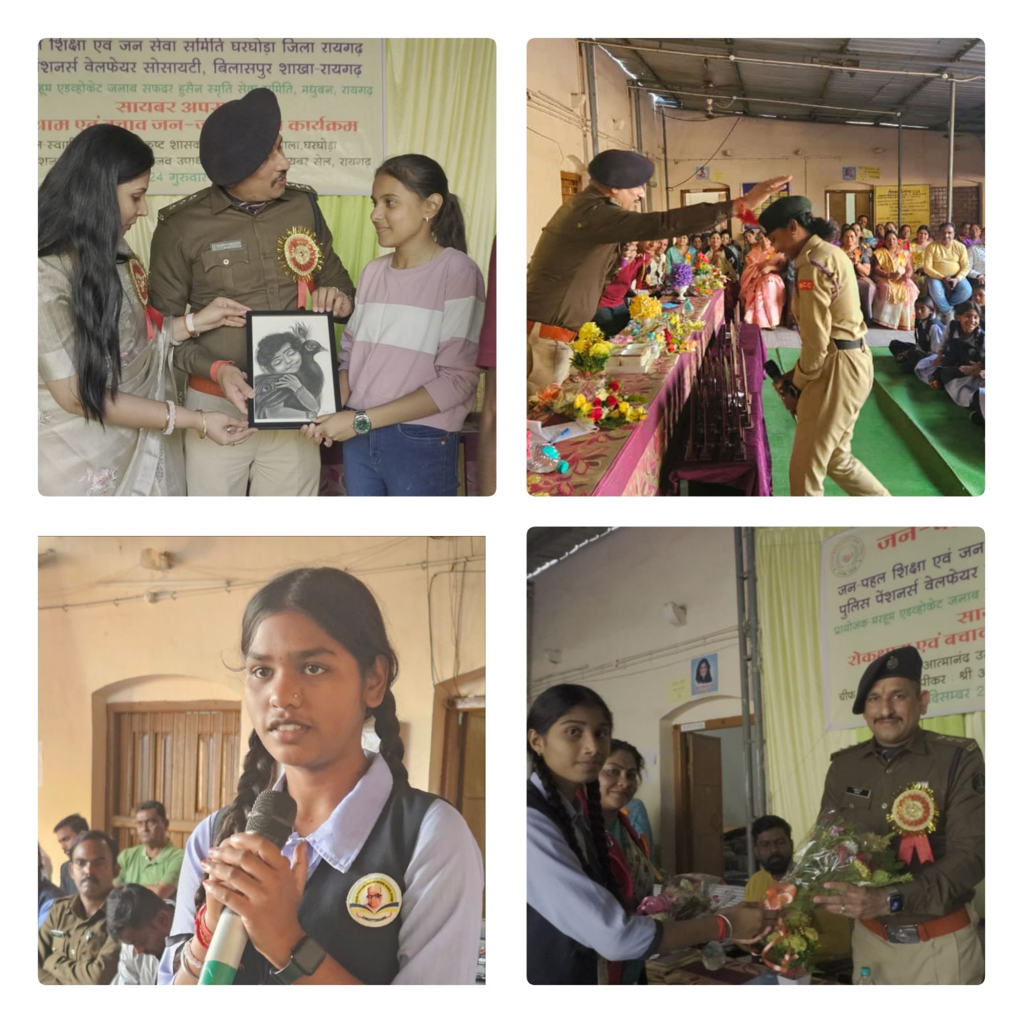 रायगढ़ पुलिस, जनपहल शिक्षा सेवा समिति घरघोड़ा,मरहूम श्री सफ़दर हुसैन वेलफेयर समिति रायगढ़ व पुलिस पेंशनर वेलफेयर सोसाइटी बिलासपुर के बैनर तले आत्मानंद कन्या उच्चतर माध्यमिक विद्यालय,सरस्वती शिशु मंदिर, प्रज्ञा विद्या पीठ एवं जनमित्रम के बच्चों और नगर के विशिष्ट जनों की उपस्थिति में साइबर अपराध के प्रति जागरूकता कार्यक्रम का श्री गणेश किया गया।इस कार्यक्रम के में मुख्य अतिथि श्री अभिनव उपाध्याय डी.एस.पी साइबर क्राइम रायगढ़ व उनकी धर्मपत्नी श्रीमती श्रुति उपाध्याय, विशिष्ठ अतिथि( श्री रामकिंकर जी (TI घरघोड़ा) श्री सुरेंद्र वर्मा (पुलिस पेंशनर वेलफेयर सोसाइटी),श्रीमती ज़रिनाज अंसारी(सफ़दर हुसैन वेलफेयर सोसाइटी),श्रीमती कविता शर्मा(जनपहल शिक्षा सेवा समिति घरघोड़ा),श्री अतहर हुसैन(मरहूम श्री सफदर हुसैन वेलफेयर सोसाइटी),श्री शिशु सिन्हा (पूर्व नगर पंचायत अध्यक्ष),श्री राजेंद्र शर्मा जी (संचालक जन मित्रम स्कूल),स्वामी आत्मानंद उच्चतर माध्यमिक कन्या विद्यालय की ओर से प्रधानाध्यापक श्री हरिश्चंद्र बेहरा जी की उपस्तिथि में संपन्न हुआ।कार्यक्रम में घरघोड़ा के होनहार विद्यार्थियों को सम्मानित किया गया।