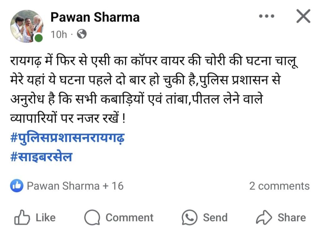 आज सोशल मीडिया ग्रुप पर भाजपा नेता पवन शर्मा एवं पत्रकार साकेत पांडे द्वारा एक से कॉपर वायर की घटना को लेकर पुलिस को सचेत रहने की अपील की है।पवन शर्मा ने लिखा है कि पुलिस प्रशासन से अनुरोध है कि सभी कबाड़ियों एवं तांबा,पीतल लेने वाले व्यापारियों पर नजर रखें।