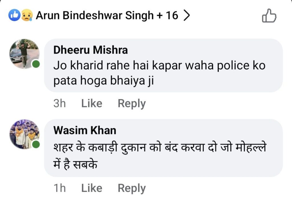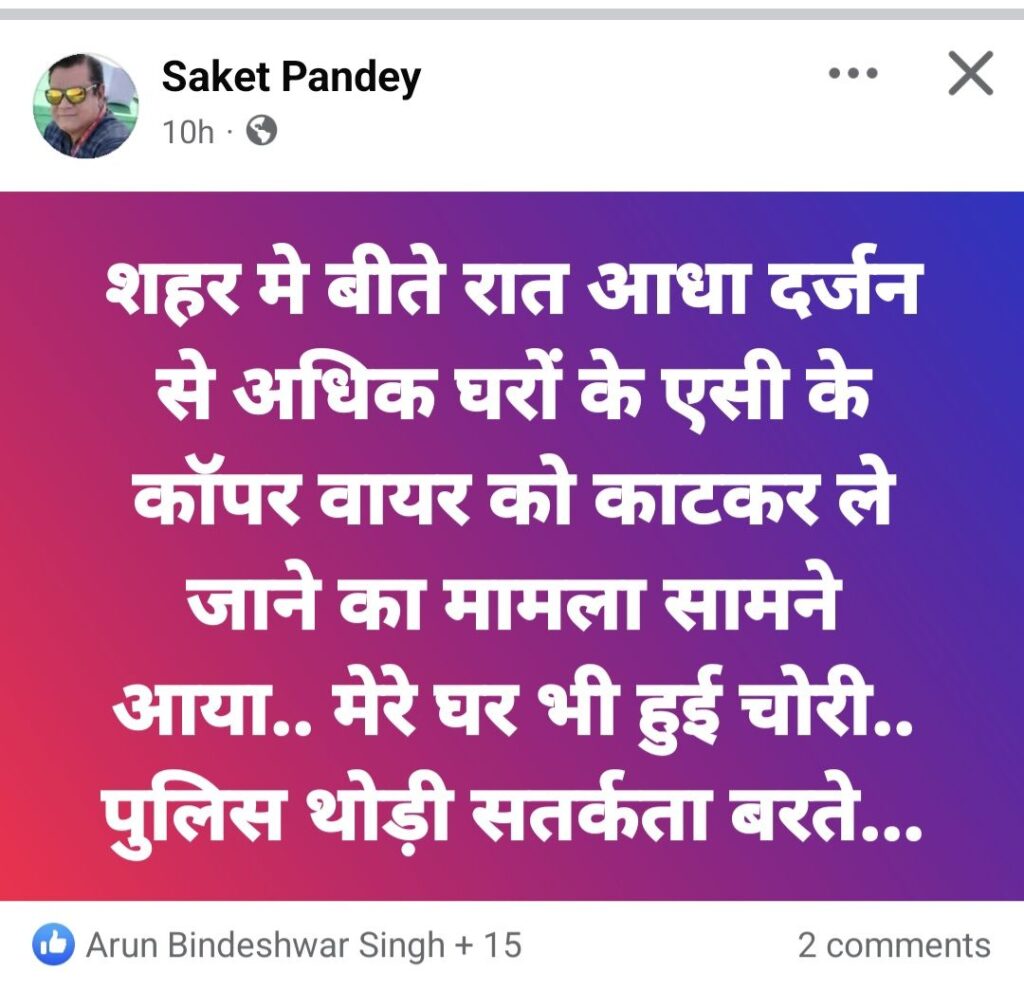 वही पत्रकार साकेत पांडे ने लिखा है कि शहर मे बीते रात आधा दर्जन से अधिक घरों के एसी के कॉपर वायर को काटकर ले जाने का मामला सामने आया.. मेरे घर भी हुई चोरी.. पुलिस थोड़ी सतर्कता बरते। कांग्रेसी नेता वसीम खान ने लिखा है कि शहर के कबाड़ी दुकान को बंद करवा दो जो मोहल्ले में है सबके।
