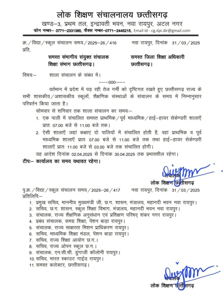 छत्तीसगढ़ में स्कूलों के समय में हुआ परिवर्तन, प्रातः 7 बजे से 11 बजे तक होगी पढ़ाई आदेश हुए जारी