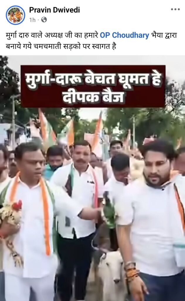 भाजपा नेता प्रवीण द्विवेदी ने फेसबुक पर पोस्ट करते हुए लिखा है कि “मुर्गा दारु वाले अध्यक्ष जी का हमारे OP Choudhary भैया द्वारा बनाये गये चमचमाती सड़को पर स्वागत है” और इन्होंने पोस्ट में एक वीडियो भी डाला हुआ है