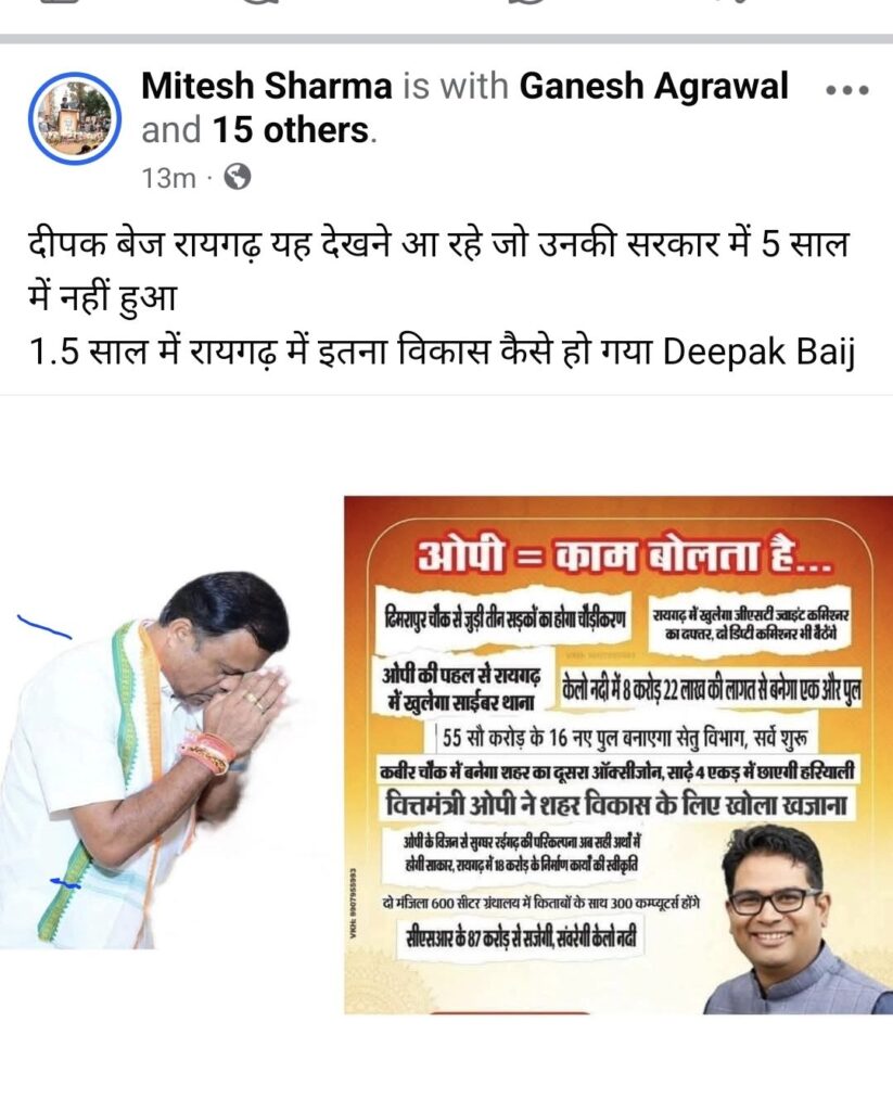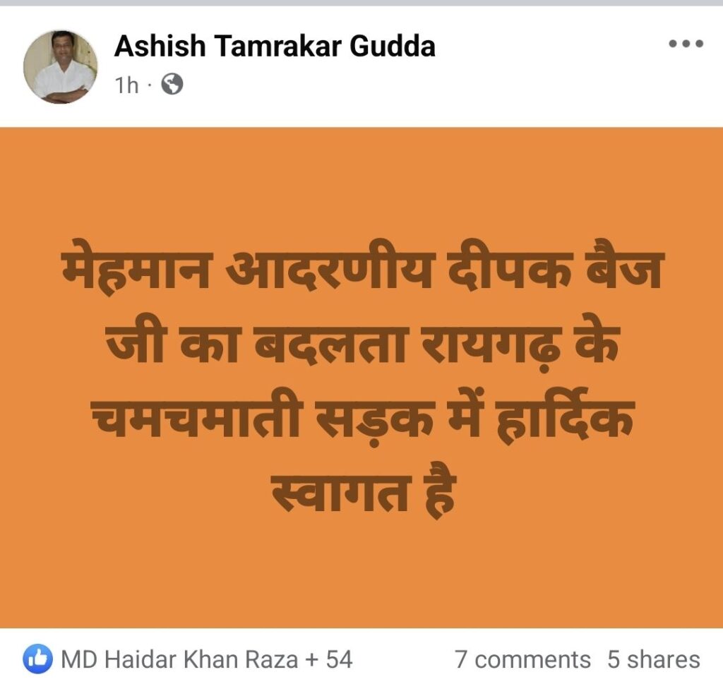 कांग्रेस प्रदेश अध्यक्ष दीपक बैज के रायगढ़ आगमन को लेकर भाजपा कार्यकर्ताओं का सोशल मीडिया पर व्यंगात्मक पोस्ट