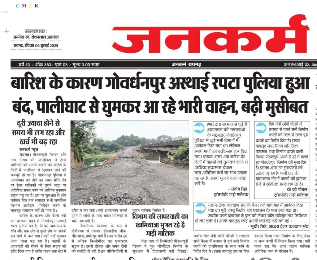 वित्त मंत्री ओपी चौधरी ने बरसात से पहले सभी निर्माण कार्यों को जल्द से जल्द पूरा करने का निर्देश दिया है। इसके बावजूद नगर निगम और जिला प्रशासन तथा निर्माण करने वाली विभाग पीडब्ल्यूडी अपने ही ढ़र्रे में चलते हुए गोवर्धनपुर निर्माण की भुला दिए है। इसका असर हम ट्रांसपोर्टरों को उठाना पड़ रहा है। पाली घाट के खतरनाक मोड़ में वाहनों की दुर्घटना होने से अतिरिक्त समय लग रहा है।