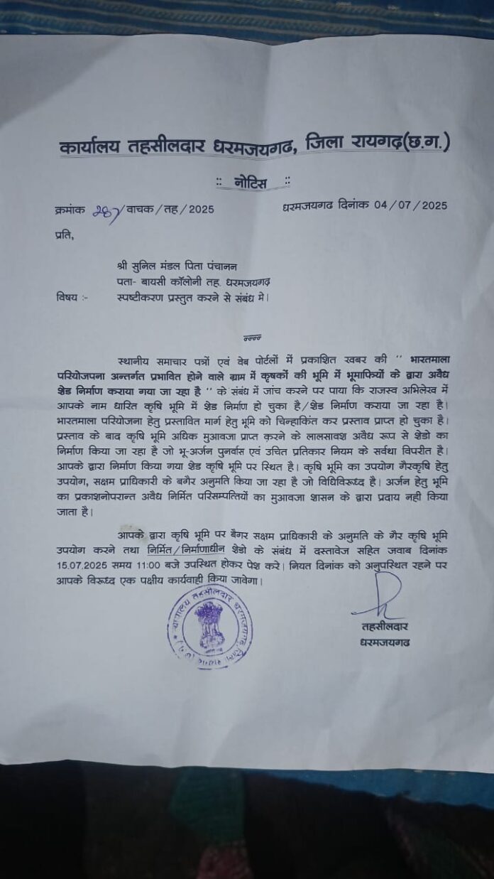 रायगढ़। भारतमाला परियोजना के अंतर्गत प्रस्तावित राजमार्ग निर्माण के लिए चिह्नित की गई कृषि भूमि पर अनधिकृत रूप से शेड निर्माण का मामला तूल पकड़ता जा रहा है। जिसमें कलेक्टर को पत्र लिखकर कार्रवाई का निर्देश दी थी। जिसमें तहसील कार्यालय, धरमजयगढ़ द्वारा भूमि स्वामियों को विधिवत नोटिस जारी किया गया है।