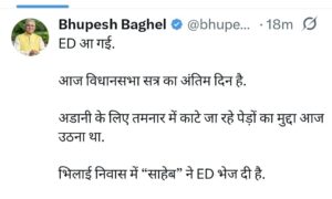 पूर्व मुख्यमंत्री भूपेश बघेल के निवास स्थान पर तड़के आज सुबह ED के रेड की खबर सामने आ रही है जिसकी जानकारी खुद पूर्व मुख्यमंत्री भूपेश बघेल ने सोशल मीडिया में X के माध्यम से दी है उन्होंने अपने “X” अकाउंट पर लिखा कि