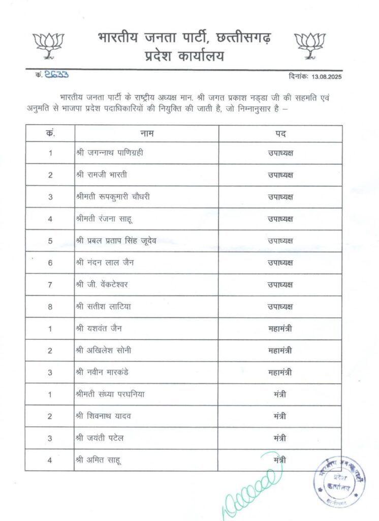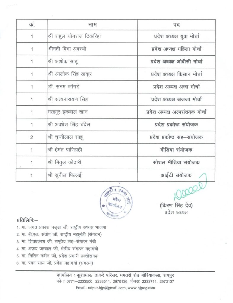 रायगढ़ छत्तीसगढ़ राजनीति टेक्नोलॉजी व्यापार स्वास्थ्य क्राइम रायपुर बिलासपुर खरसिया सारंगढ़ HomeBlogभाजपा छत्तीसगढ़ के प्रदेश पदाधिकारियों की हुई घोषणा Blog भाजपा छत्तीसगढ़ के प्रदेश पदाधिकारियों की हुई घोषणा By www. jankarm.com August 13, 2025 माननीय भाजपा राष्ट्रीय अध्यक्ष जेपी नड्डा की सहमति से भाजपा प्रदेश अध्यक्ष किरण सिंह देव ने भाजपा छत्तीसगढ़ के प्रदेश पदाधिकारियों की घोषणा की। Share FacebookTwitterWhatsAppTelegramCopy URL Previous articleशहीद कर्नल विप्लव त्रिपाठी स्टेडियम में हुआ स्वतंत्रता दिवस समारोह का फुल ड्रेस रिहर्सलNext articleछत्तीसगढ़ बनेगा शिक्षा और इनोवेशन का हब www. jankarm.com JANKARM DAILY EPAPER Recent Artical Blog जतन कर्मियों के वेतन और रखरखाव के लिए फिजियोथेरेपी दर हुआ दुगना www. jankarm.com - October 14, 2025 0 जिला स्तरीय विज्ञान विज्ञान सेमिनार का भव्य आयोजन October 13, 2025 कलेक्टर एसपी कॉन्फ्रेंस October 13, 2025 मुख्यमंत्री विष्णुदेव साय झगरपुर में रणेश्वर रामचण्डी मंदिर के वेदी पूजन में हुए शामिल October 11, 2025 प्रधान मंत्री मोदी जी ने कोरोना की वैश्विक महामारी के समय सबसे पहले ‘आत्मनिर्भर भारत’ का दिया था मंत्र October 10, 2025 रविशंकर मार्केट की 22 दुकानों को पीछे शिफ्ट करने का शासन को भेजा प्रस्ताव October 10, 2025