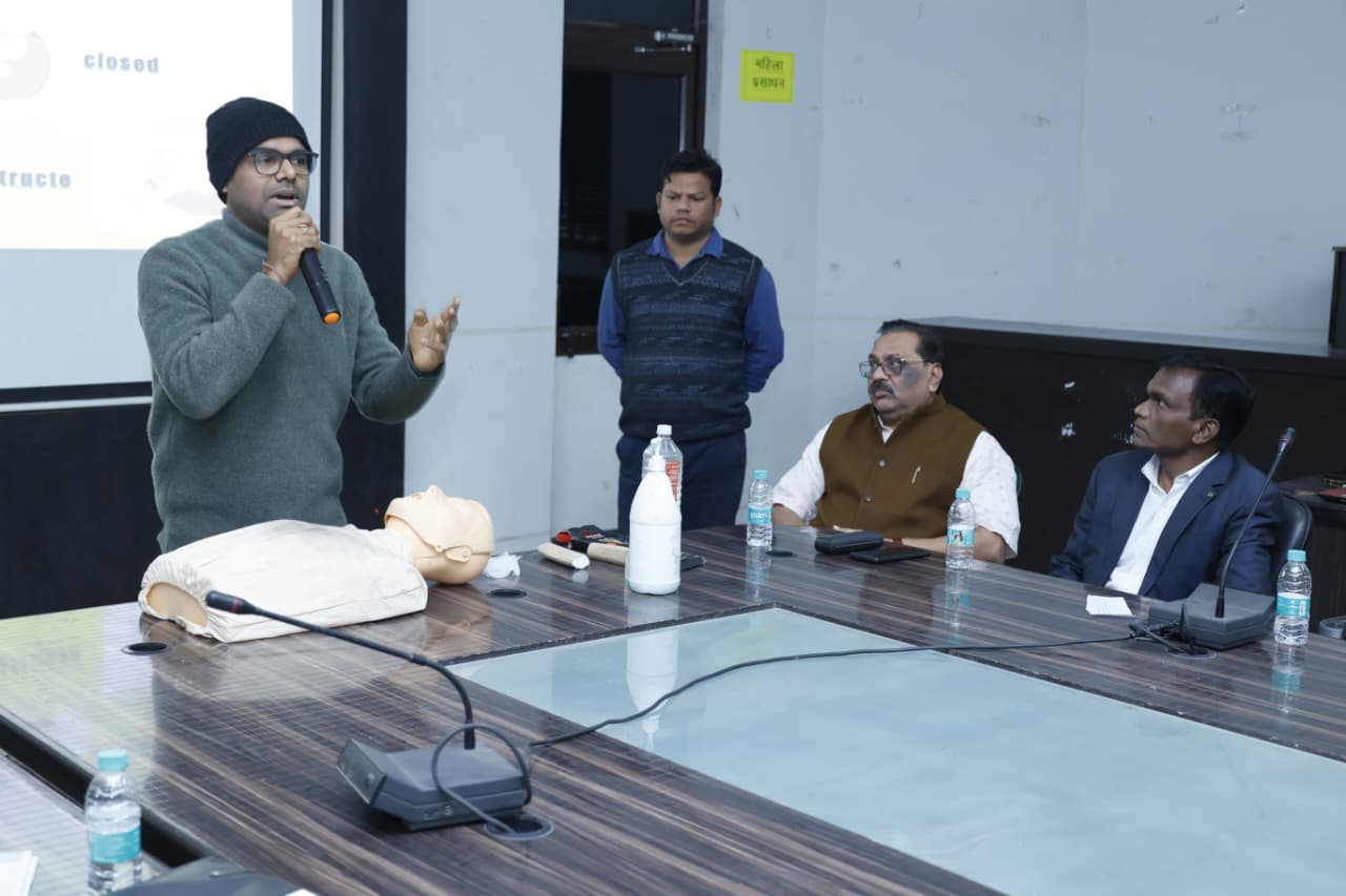 रायगढ़, 12 दिसम्बर 2025/ भारतीय रेडक्रॉस सोसायटी जिला शाखा रायगढ़ द्वारा जनकल्याणकारी गतिविधियों की श्रृंखला को आगे बढ़ाते हुए आज कलेक्टोरेट स्थित सृजन सभाकक्ष में प्राथमिक उपचार एवं सीपीआर का विशेष प्रशिक्षण कार्यक्रम आयोजित किया गया। यह प्रशिक्षण कलेक्टर एवं अध्यक्ष, भारतीय रेडक्रॉस सोसायटी जिला शाखा रायगढ़ श्री मयंक चतुर्वेदी के निर्देशन तथा चेयरमेन श्री मुकेश शर्मा, सचिव एवं मुख्य चिकित्सा एवं स्वास्थ्य अधिकारी डॉ. अनिल कुमार जगत, प्रभारी अधिकारी डॉ. एच.एस. उरांव तथा राज्य प्रबंध समिति के सदस्य श्री संतोष अग्रवाल के मार्गदर्शन में संपन्न हुआ।