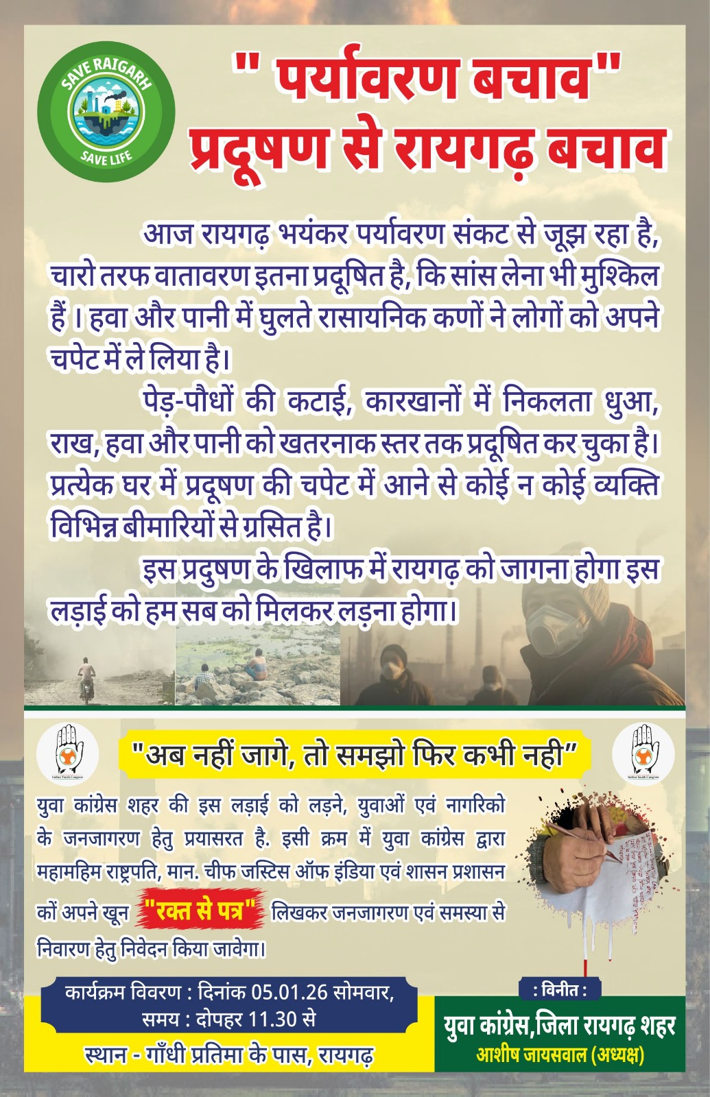 युवा कांग्रेस जिलाध्यक्ष आशीष जायसवाल ने बताया इस कार्यक्रम के माध्यम से रायगढ़ की जनता को प्रदूषण के दुष्परिणामों से अवगत कराते हुए शासन-प्रशासन का ध्यान इस गंभीर समस्या की ओर आकर्षित किया जाएगा। कार्यक्रम के दौरान युवा कांग्रेस द्वारा एक अनूठे प्रतीकात्मक विरोध के रूप में अपने खून से“रक्त से पत्र” लिखकर महामहिम राष्ट्रपति महोदय, माननीय मुख्य न्यायाधीश (सुप्रीम कोर्ट/एनजीटी) एवं संबंधित प्रशासनिक अधिकारियों को भेजा जाएगा, ताकि रायगढ़ को प्रदूषण से मुक्ति दिलाने हेतु ठोस एवं त्वरित कदम उठाए जा सकें।