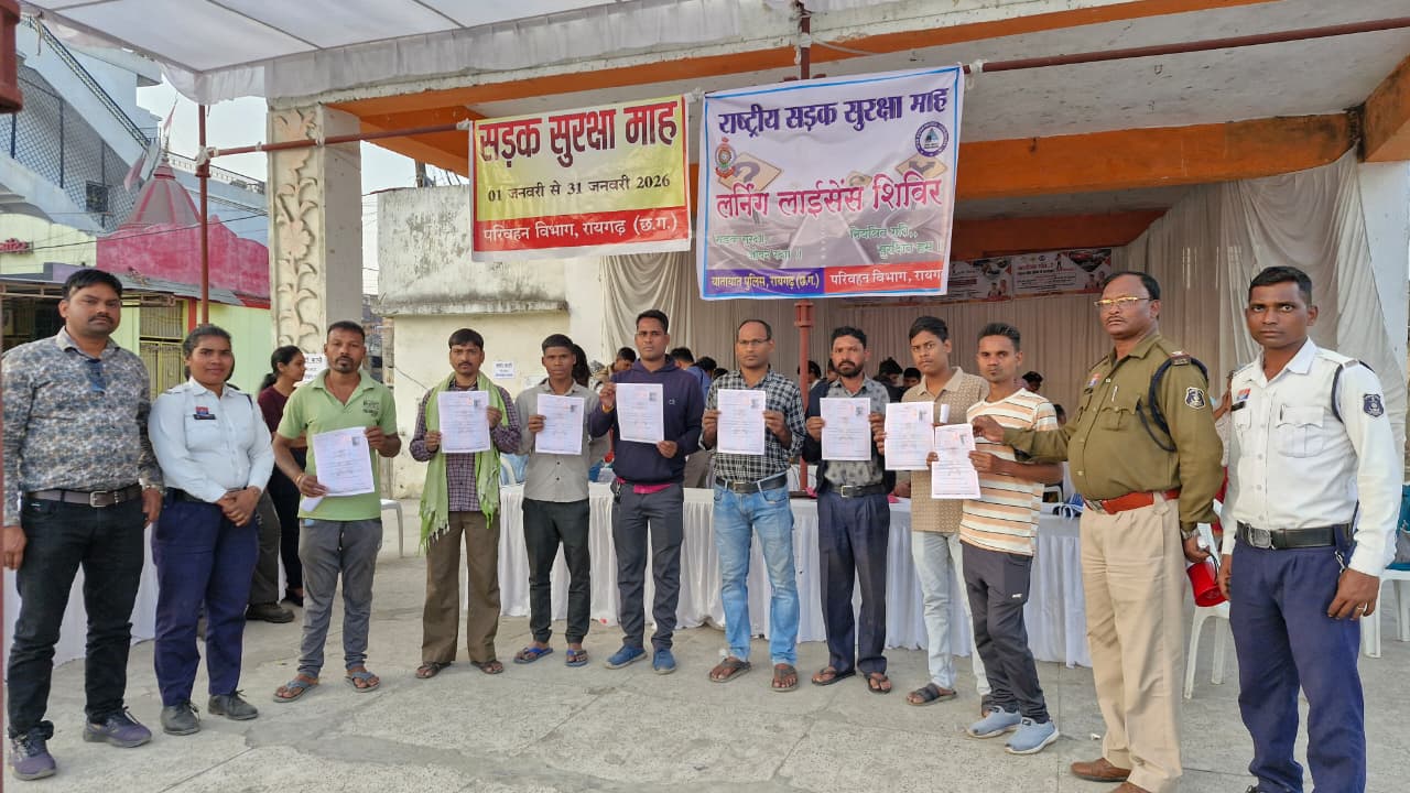 रायगढ़, 13 जनवरी । राष्ट्रीय सड़क सुरक्षा माह 2026 के अंतर्गत सड़क सुरक्षा एवं यातायात नियमों के प्रति जागरूकता बढ़ाने के उद्देश्य से दिनांक 13 जनवरी 2026 को रायगढ़ में लर्निंग लाइसेंस शिविर का सफल आयोजन किया गया।