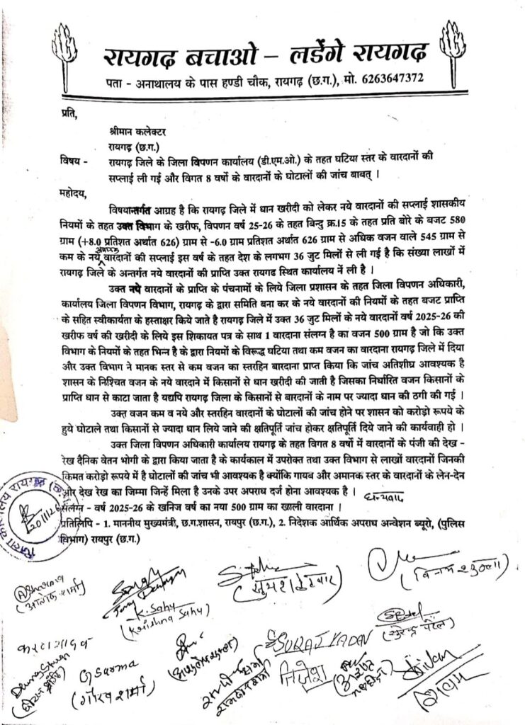 रायगढ़ बचाओ – लड़ेंगे रायगढ़ के विनय शुक्ला,अज्ञात मल्होत्रा,कृष्णा साहू,आशुतोष शुक्ला,ऋषभ मिश्रा,सुरेन्द्र पटेल,मानस,तिजेश जायसवाल,शिवम कच्छवाहा,सूरज यादव,रामदीन शर्मा,देवेश प्रधान,सिंटू गुप्ता आदि ने संयुक्त रूप से बताया कि उनके ग्रामीण सदस्यों के अनुसार जिले में धान खरीदी को लेकर जिला विपणन विभाग,रायगढ़ ने नए बारदानों की सप्लाई धान खरीदी केंद्रों में दी है जिसका वजन करने से 500 ग्राम के प्रत्येक नए बोरे निकले।जिसको लेकर धान केंद्रों में किसानों ने आपत्ति की और बताया कि नए बारदानों 500 ग्राम के हैं और इसके नाम से 600 ग्राम धान किसानों से लिया जाना गलत है।जब खरीदी केंद्रों में किसानों की बात नहीं सुनी गई तो किसानों के प्रतिनिधि मंडल के मय सबूत और शिकायत ज्ञापन के साथ रायगढ़ के कलेक्टर मयंक चतुर्वेदी महोदय से भेंट किया गया और उन्हें ज्ञापन के साथ 500 ग्राम का घटिया और अमानक स्तर का नया बोरा प्रस्तुत किया।इस ज्ञापन में आग्रह किया कि रायगढ़ जिला विपिन विभाग के द्वारा देश की लगभग 36 जुट मिलो से लगभग 2 करोड़ 52 लाख के लगभग नया बारदाना रायगढ़ जिले के वर्ष 2025 – 26 के धान खरीदी के लिए नया बोरा की सप्लाई ली गईं जो कि प्रदेश के विपणन विभाग के नियमों के तहत वर्ष 2025-26 के तहत बिंदु 15 के अंतर्गत 580 ग्राम(+8.0% अर्थात 626ग्राम से – 6.0% अर्थात 626 ग्राम से अधिक वजन वाले तथा 545 ग्राम से कम होने पर अमानक स्तर के माने जाते हैं कि सप्लाई प्राप्त कर करोड़ों रुपए के भ्रष्टाचार को अंजाम दिया है। इस नए बारदानों कि सुपुर्दगी के लिए जिला विपणन विभाग के द्वारा 4 सदस्यीय सरकारी विभागों की सत्यापन समिति बनाई गई और जिसमें रायगढ़ जिले में केवल खानापूर्ति कर नए बोरों की सुपुर्दगी ले ली गई। 100 ग्राम कम का नया बोरा मतलब करोड़ों के भ्रष्टाचार को अंजाम देना में जिला विपणन विभाग, रायगढ़ के अधिकारियों और कर्मचारियों की करतूत की जांच कड़ाई से होगी तो पता चलेगा कि किसानों के नाम से इस नए बारदानों का घोटाला किसकी शह पर हुआ और इसके नाम से किसानों से 100 ग्राम ज्यादा धान लेने का फायदा संगठित हो कर किस विभाग के सरकारी अधिकारी ने उठाया।