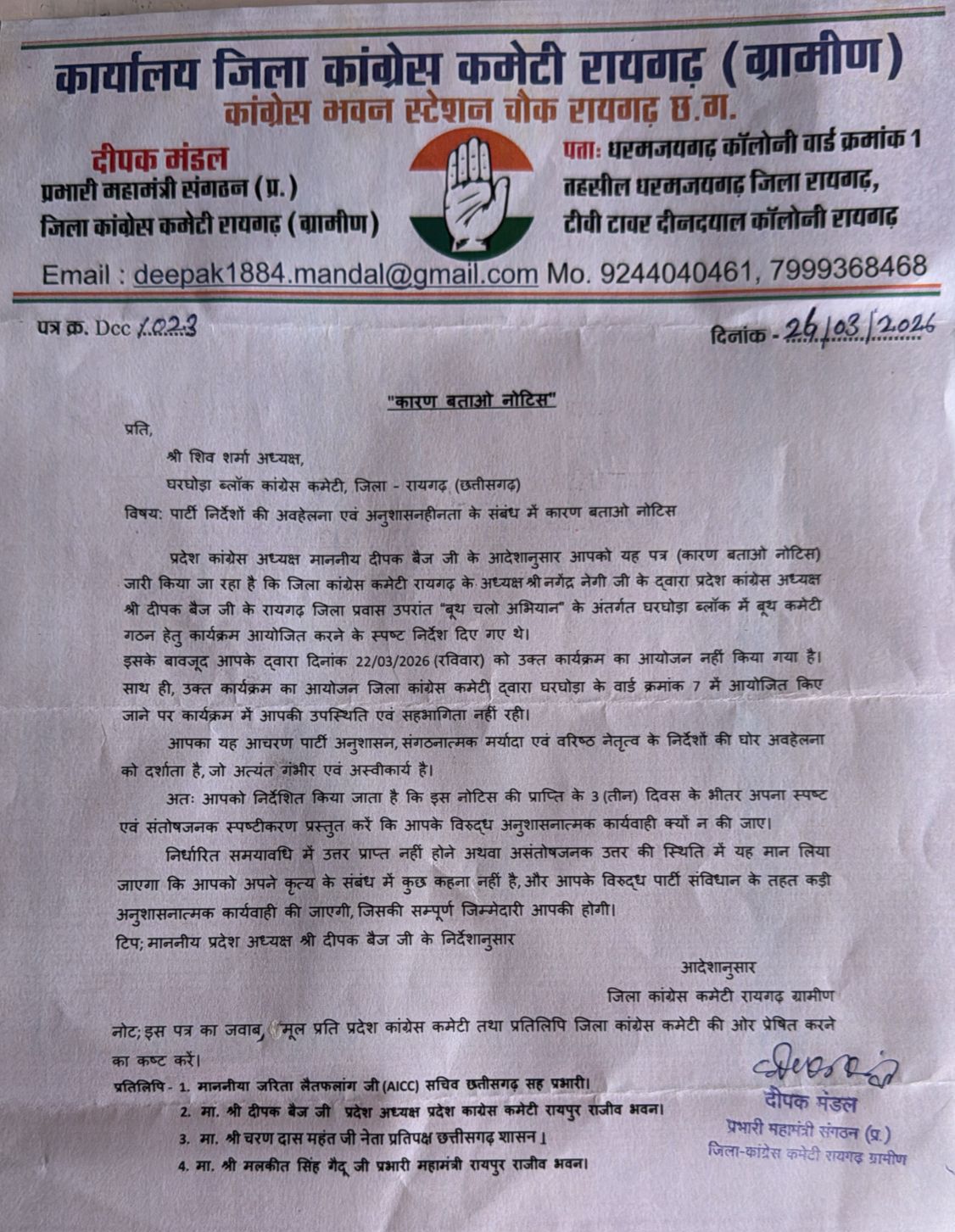 पार्टी निर्देशों की अवहेलना पर घरघोड़ा ब्लॉक कांग्रेस अध्यक्ष को कारण बताओ नोटिस