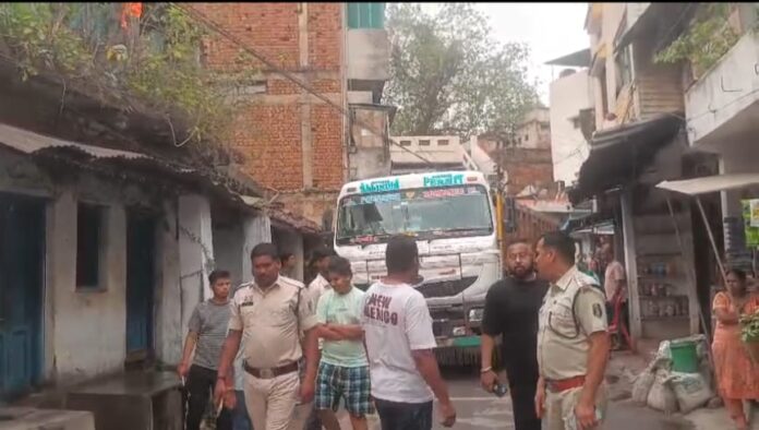 शहर की तंग गलियों में घुसा 18 चक्का वाहन, कई वाहन व मकानों के चबूतरे क्षतिग्रस्त, शहर में भारी वाहनों की नो एंट्री पर सवालिया निशान