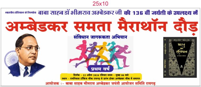 डॉ अंबेडकर जयंती के अवसर पर 12 अप्रैल सुबह 6:00 बजे रामनिवास टॉकीज चौक रायगढ़ से शुरू होगी मैराथन दौड़